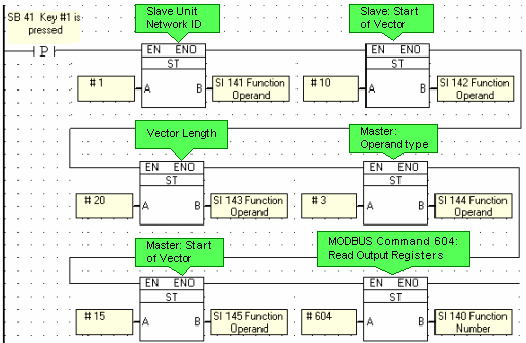 Store 4080 into SI 142 (Slave: Start of Vector parameter), 2 into SI 143 (Read: Vector Length parameter), 3 into SI 144 (Master: Operand Type),and 604 into SI 140. Within the slave PLC, the master PLC will read the values of MI 32 - MI 40 and copy them into its own registers, SI 80 - SI 81.