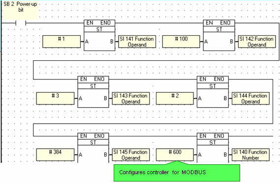 These parameters configure a controller for MODBUS communications. A device is configured for MODBUS by storing the value 600 into SI 140.