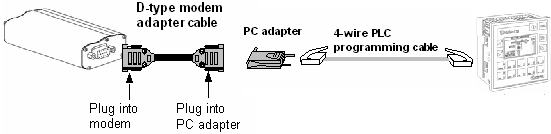 Note that you must remove the PC adapter from the PLC programming cable and replace it with the modem adapter supplied in the kit. |