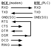 The next figure shows the interface between the Data Communications Equipment (DCE; the modem) and the Data Terminal Equipment (DTE; the controller or PC). The arrows show the direction of data flow. Note that: