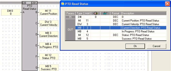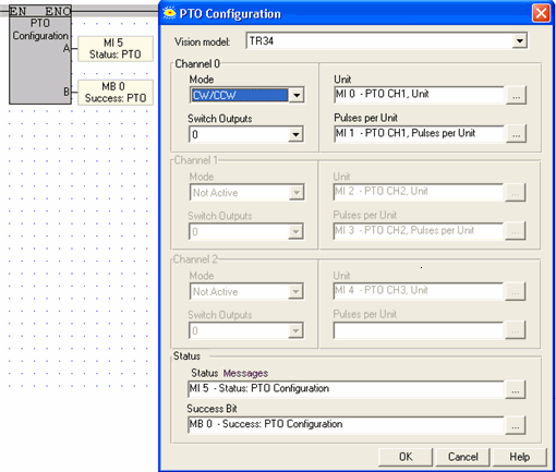 0 - OK 1 - Invalid configuration data 2 - Currently in motion ( function cannot be performed during acceleration or deceleration) 3 - Invalid channel 4 - PTO Configuration block does not exist 5 - Out of range 6 - Maximum value is out of range |