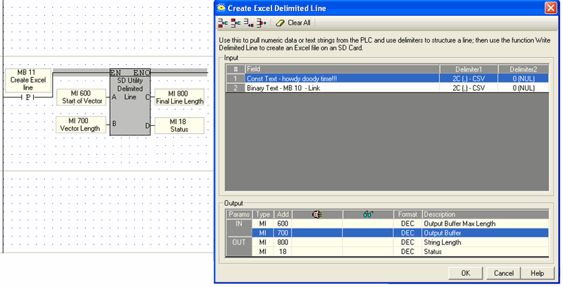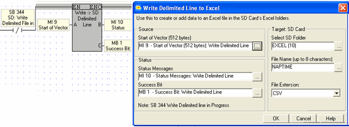 You can write PLC data to Excel files an the SD card using the functions Create Delimited Line to structure a line, and Write Delimited Line to send it to a specified Excel file on an SD Card.