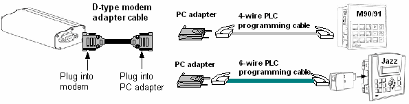 Unitronics' kits contain all of the elements you need to connect a controller to a modem using the appropriate PLC programming cable, as shown in the first two figures at the beginning of this section.