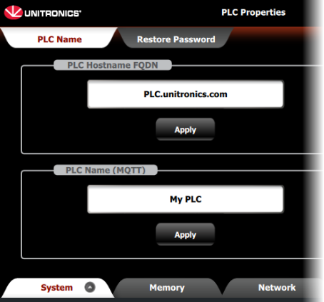 Select the System tab, then press the arrow at the right side of the screen to view and press the PLC Properties option.