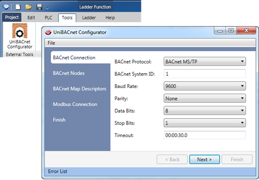 Use the UniBACnet Configurator, located under the new Tools tab on the UniLogic ribbon, to create a configuration file for the BACnet to MODBUS Gateway. Download this file to the GW-BAC1 in order to set up communications between a UniStream controller and BACnet slave devices.