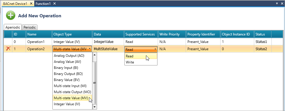 For each BACnet Device created, you can add Aperiodic or Periodic operations. The parameters differ as listed in the next table.