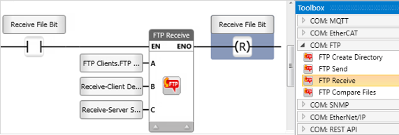 Use the FTP Receive function to receive a file from a remote FTP Server and save it to the controller's SD card
