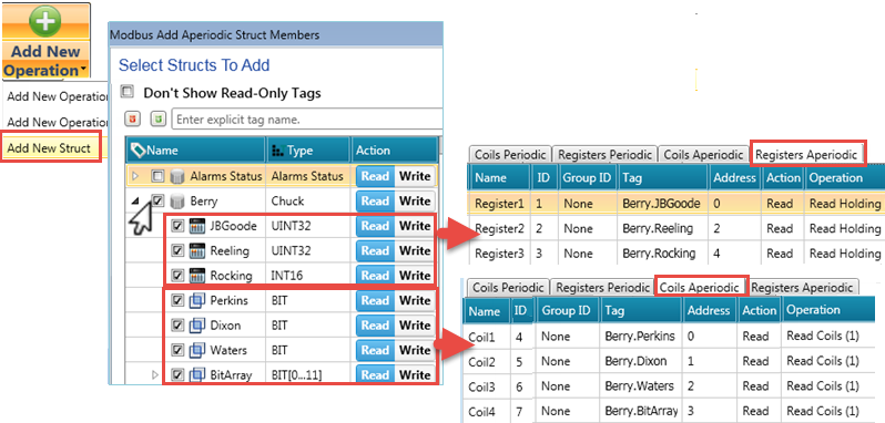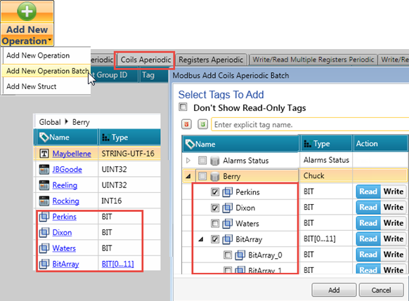 Check the tags you want, and click Add. In the struct shown below, a bit array is selected, along with two individual bits.