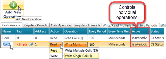 Note that while the Active Periodic setting in Properties determines whether the master will run operations periodically, you can prevent an individual operation from running. To do this, assign a bit to the operation's Active parameter. To prevent the operation from running, turn this bit OFF. |