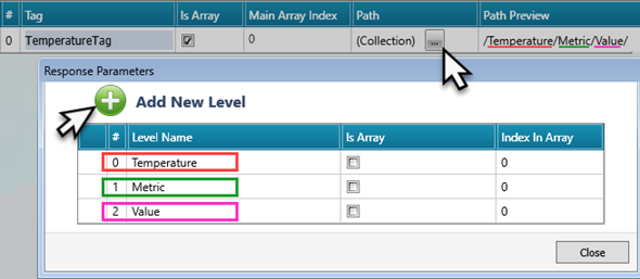 Add another Response Parameter and name it TemperatureText, then click Add New Level, enter WeatherText, and click close.
