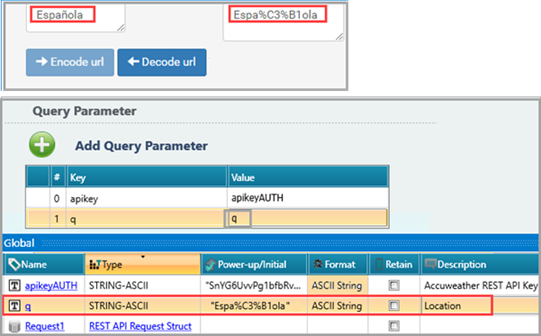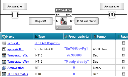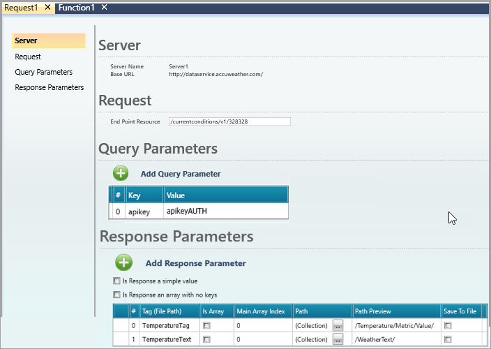 The example below shows how to build a JSON GET request for weather data for the city of London, using the REST API from Accuweather.