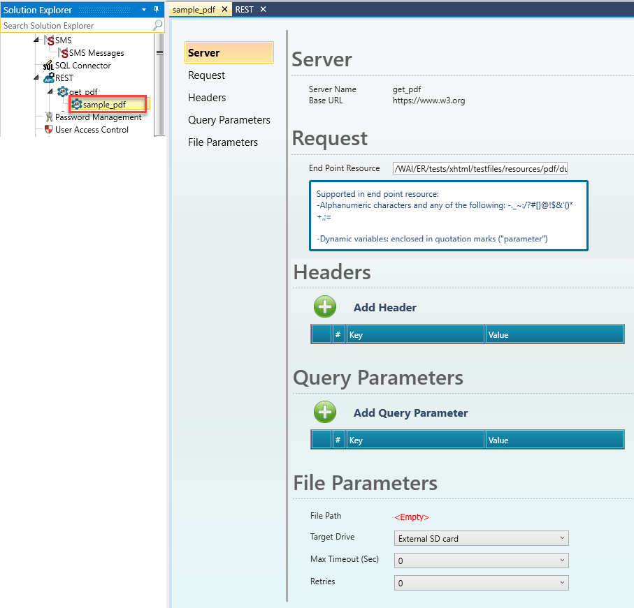 Click on the request name; the request configuration window opens; enabling you to configure the File Parameters for downloading files from a web server and saving them to an SD card or USB drive.