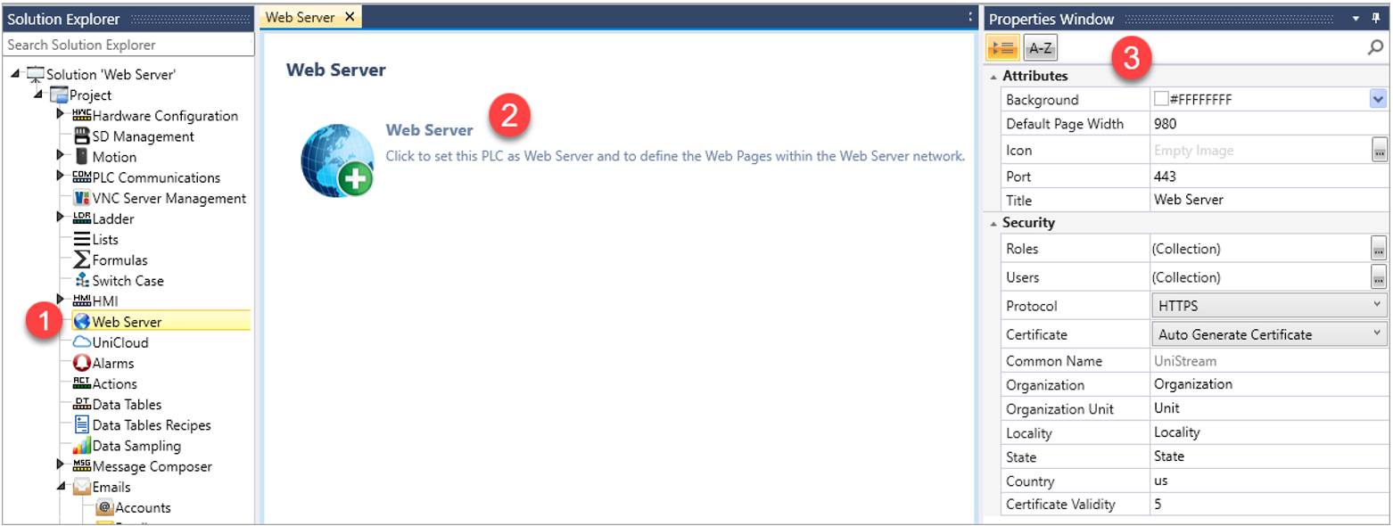 However, you can configure additional Web Server properties at any time by clicking Web Server from the Solution Explorer to open the Properties Window.