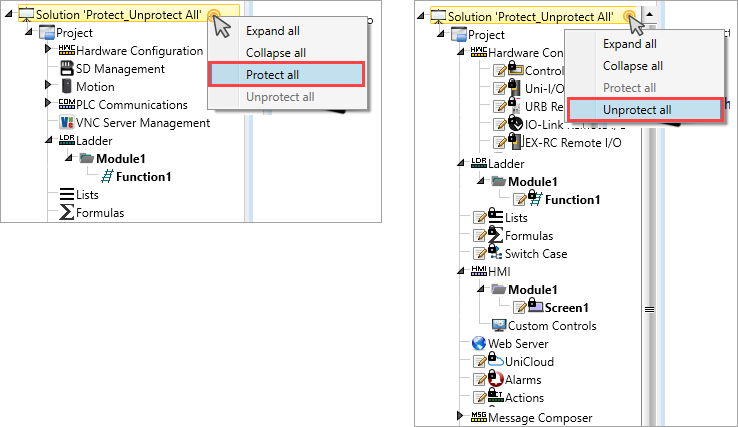 You can right-click the top-level Project node on the Solution Explorer to password-protect all supported Project Tree elements using a single centralized action, in order to prevent unauthorized edits to your application. This password only takes effect after you close the project. The password will be required the next time the project is opened. |