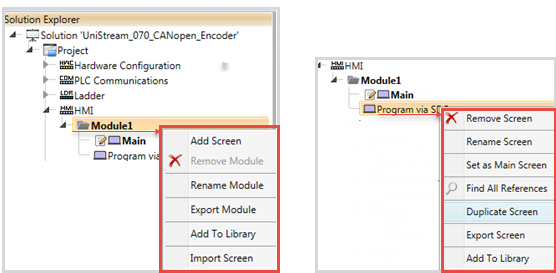 You can right-click an HMI module and select Add Screen, import a screen, or add all of the screens in the module to the Library.