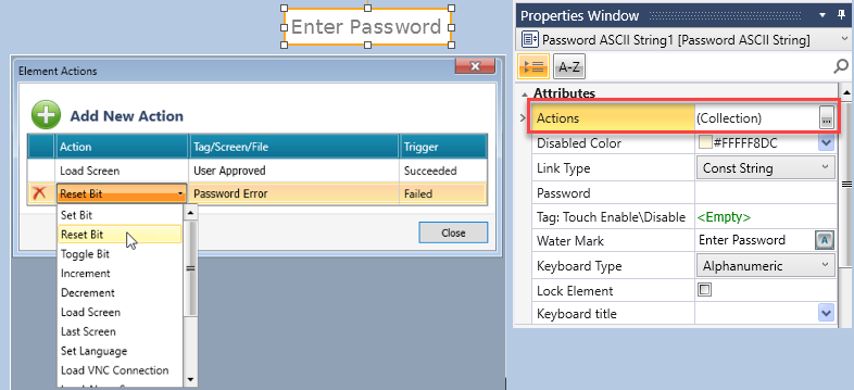Actions enable a single Touch Element to trigger multiple events. Multiple bits can be linked to one element, triggering Load screen, set, reset, and toggle bits, and more. To create an action: