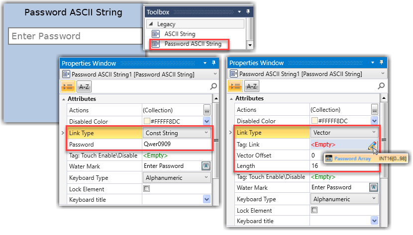 The Password ASCII String element enables password input using either a constant string or vector-based ASCII character storage. This element is designed for legacy applications requiring direct access to integer arrays or fixed password definitions.