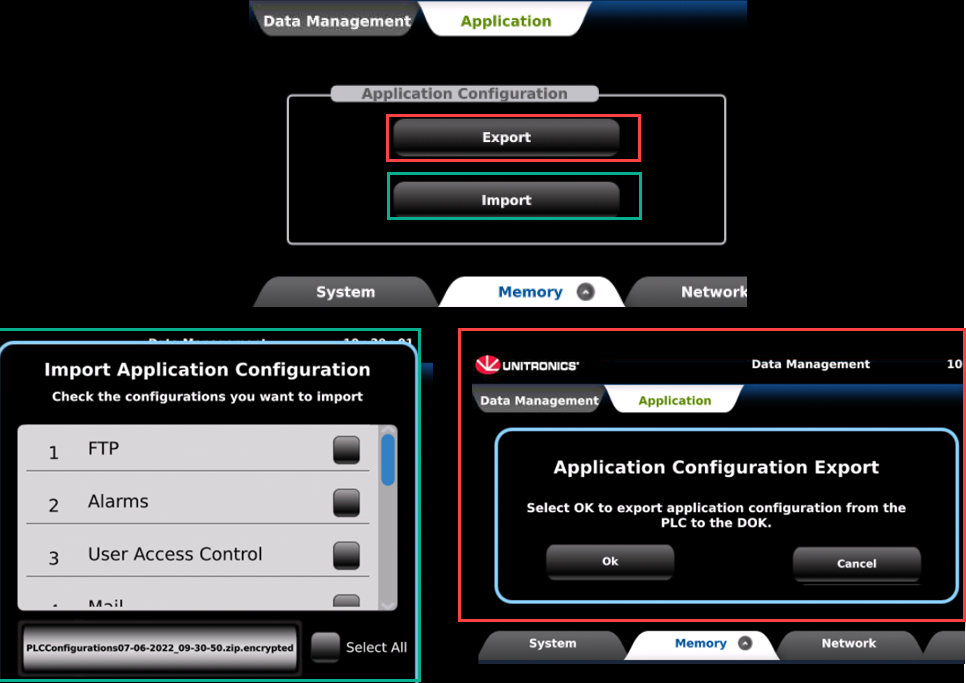 To import parameters, go to UniApps> System>Memory>Data Management> Application and select Import, and select which configurations to import.