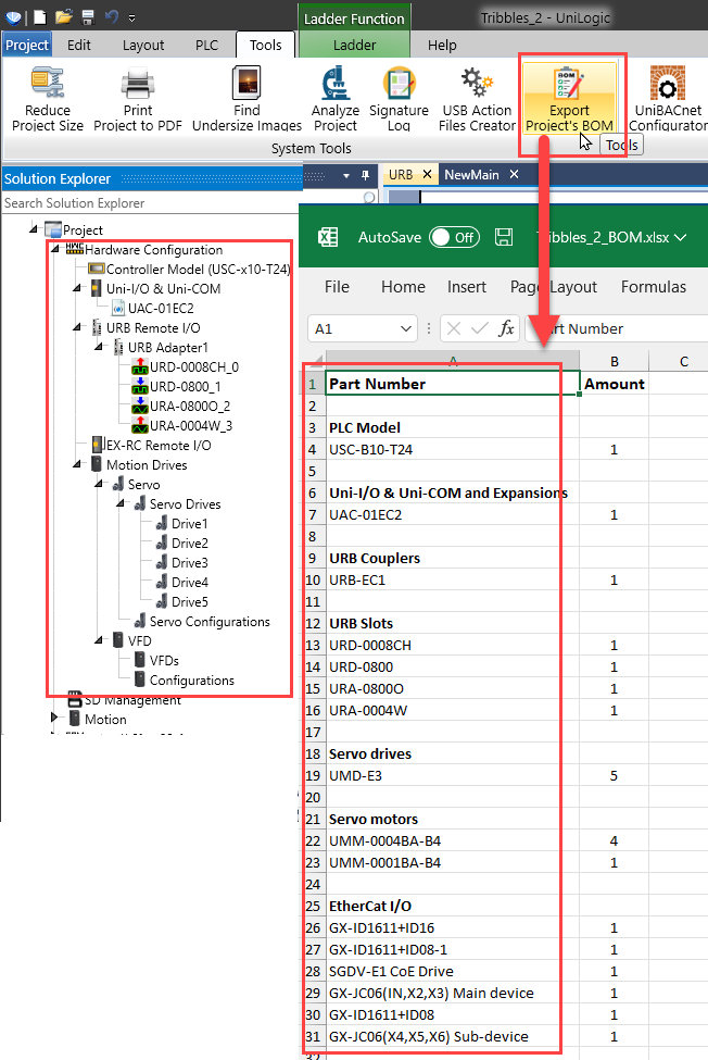 You can generate a BOM report that matches the Hardware Configuration of your project by selecting the Tool tab on the ribbon and clicking Export Project's BOM.