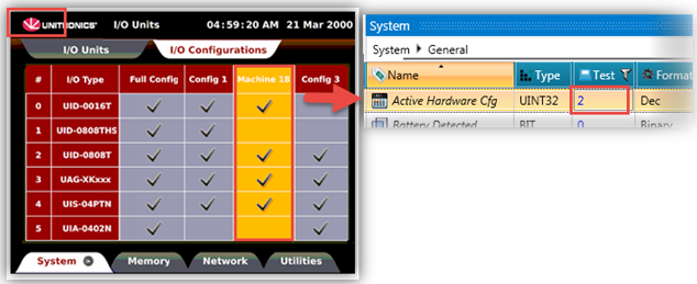 The system tag System>General>Active Hardware Config updates to show which Config is currently active.