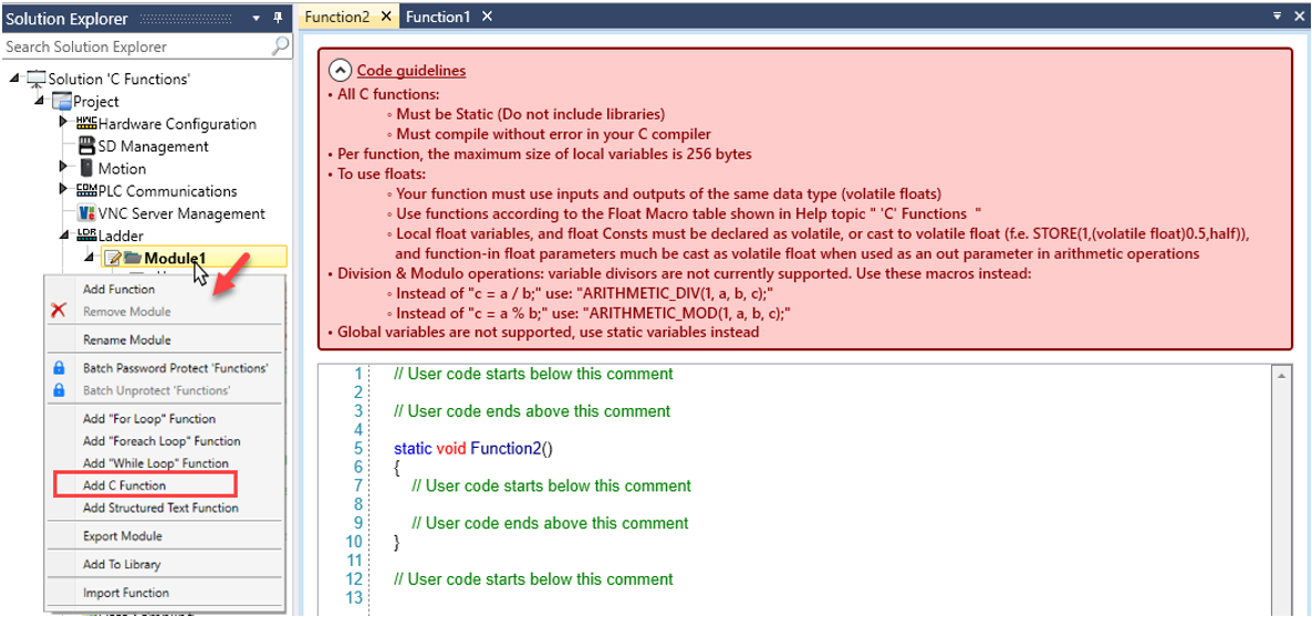 To create a function, right-click a module and select Add C Function to open the C code editor.