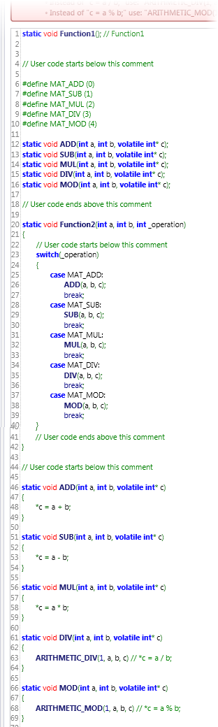The next image shows the Forward Declaration and the Main section of a C function in UniLogic.
