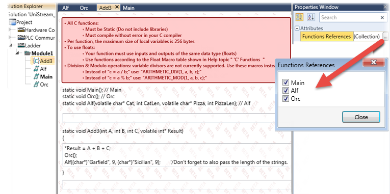 You can write C functions directly in the UniLogic editor, or copy and paste code into the C Editor fields.