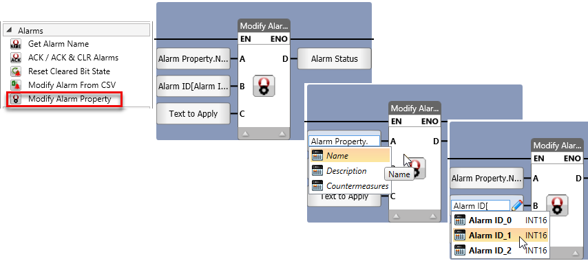 Use this Ladder element to modify the alarm properties in the system.