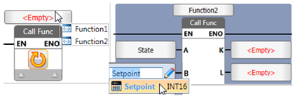 In both cases, click the field at the top of the function, select the desired function from the drop-down list, and then assign data tags to the input and output parameters.