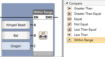 The Within Range function checks if the value in input A is within the range of values between input B and input C.