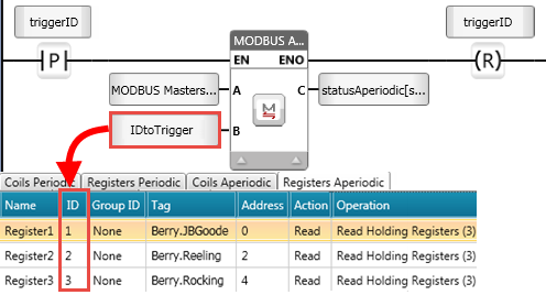 These operations allow you to run MODBUS operations via Ladder function. MODBUS Periodic operations answer most needs; Aperiodic functions allow you to perform an operation that only needs to run once, such as starting a machine, or writing a speed value to a frequency converter.