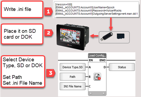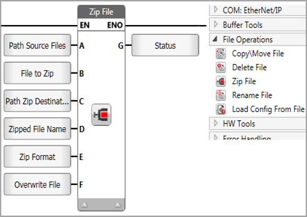 This Ladder function enables you to create an .ini file in a text editor and run it in your application to modify the parameters shown below. Use this Function to zip a source file from an SD folder, into a destination folder on the SD. Note that you can only run a maximum of two such functions during a single program scan.