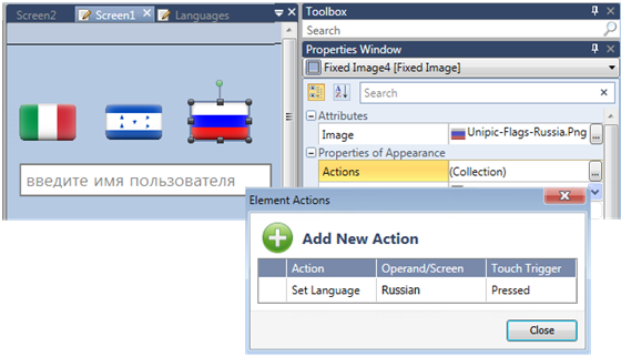 To enable the user to change language, use an HMI element Action. Note that when languages are switched at run-time, the PLC initializes.