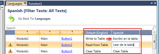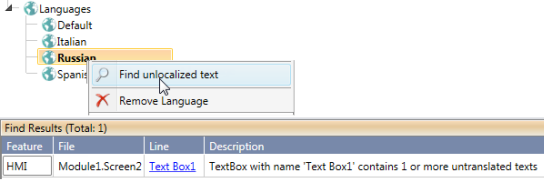 Finding untranslated text strings Right-click a language on the Solution Explorer and select Find; click the hyperlinked results to open the element.