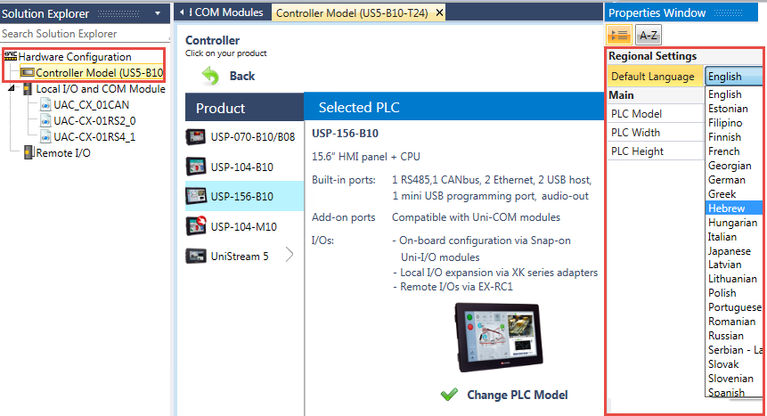 This means that UniStream will display the English keyboard when a user needs to enter data via the HMI screen. You can change this at any time via Hardware Configuration> Controller Model and selecting a different language under regional settings.