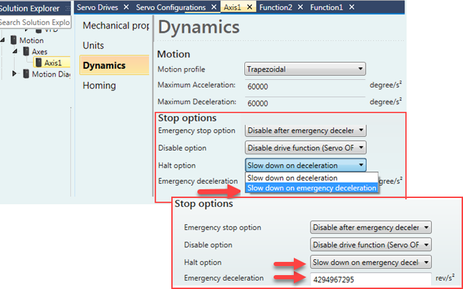 This Function Block decelerates the axis according to the emergency deceleration defined in the axis configuration, commanding a controlled motion stop and transferring the axis to the state ‘Stopping’. It aborts any ongoing Function Block execution. While the axis is in state ‘Stopping’, no other FB can perform any motion on the same axis.