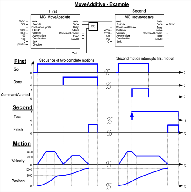 This Function Block commands a controlled motion of a specified relative distance additional to the most recent commanded position in the axis state ‘DiscreteMotion’. The most recent commanded position may be the result of a previous MC_MoveAdditive motion which was aborted.