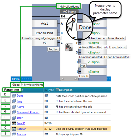 Note that each MC FB is automatically allocated a data block - a specific, reserved memory section - when you include it in your program. A data block is linked to a struct; you assign a tag for the struct name when you include the FB in your project. The parameters in these structs are read-only.