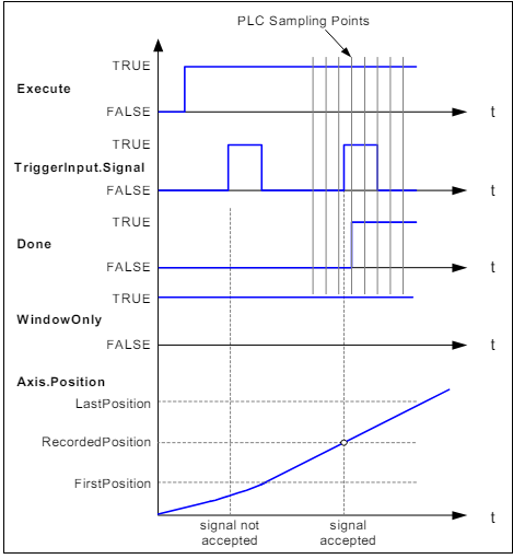 If SET, only use the window (defined in 'First Position' and 'Last Position' parameters) to accept trigger events. Positions outside the window are rejected and the external position latch is automatically newly activated. Only if the recorded position lies inside the window does Done become TRUE. In the case of absolute value positions there is exactly one window. In the case of modulo value positions the window repeats itself within the modulo cycle defined in the axis parameters (e.g. 0 to 360 degrees). |