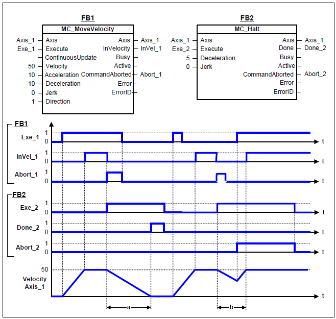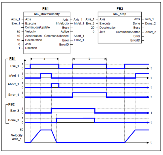The left part of the timing diagram illustrates the case if the Second FB is called after the First one is completed. If First reaches the commanded velocity 3000 then the output ‘First.InVelocity’ AND the signal next causes the Second FB to move to the velocity 2000.