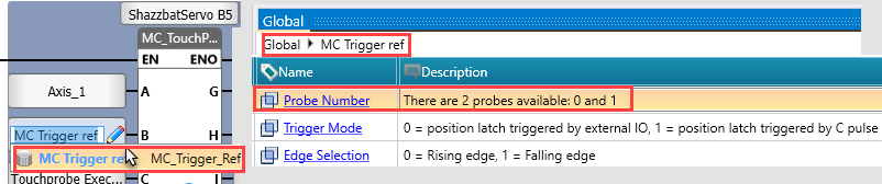 Click to select the MC Trigger_Ref block. This contains the Probe number; in your application, store 0 to select the first probe and 1 to select the second. Refer to the drive manual for probe wiring instructions. You can also use MC Trigger_Ref to switch the trigger mode to C pulse, and to change the Edge Selection on the fly in your application. |