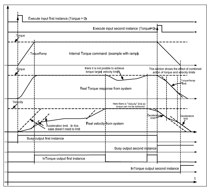 The example below shows the typical behavior of an intermediate “resistive” load (see ‘Deceleration’ limit) with some “inertia” (see ‘TorqueRamp’ limit).