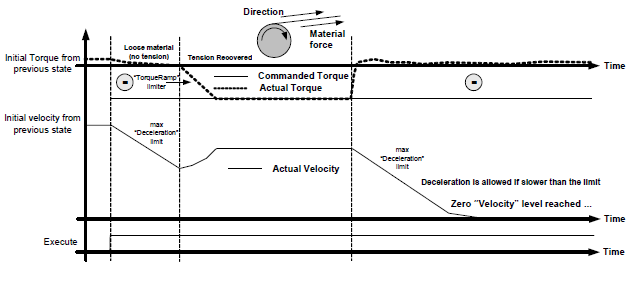 The second example (below) opposite signs for ‘Direction’ & ‘Torque’ are used (e.g. Retention or brake control). (In the FB: +Direction –Torque). It is like an unwinding application with torque on the material, and a break in the material. When the material breaks, as shown in the middle of the picture, this causes a drop in the real Torque value (in absolute terms): the velocity will decrease, limited by the fastest “deceleration” limit specified by the ‘Deceleration’ VAR_INPUT down to zero velocity (with no tension there is a risk of having shock breakings, so we have to limit to the fastest). In this case the torque setpoint might not be achieved.