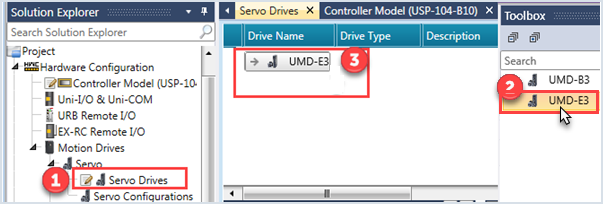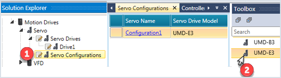 Select Servo Configurations in the Solution Explorer. In the Toolbox, double-click or drag your EtherCAT UMD into the Configuration window; UniLogic creates a Configuration. An EtherCAT Drive is marked by an E, such as the UMD-E3 shown below