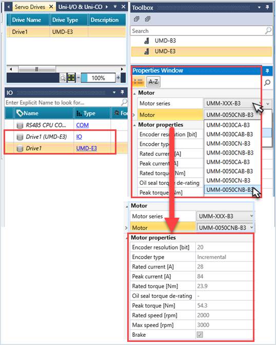 Click Motor Series and select your series, and then select your motor's model; UniLogic displays the motor's properties.