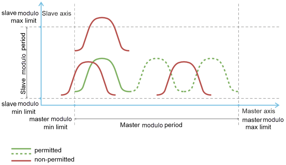 The minimum modulo limit for the master axis should match the starting point of the CAM table. Additionally, the CAM table range on the slave axis must fall within the slave axis modulo range.