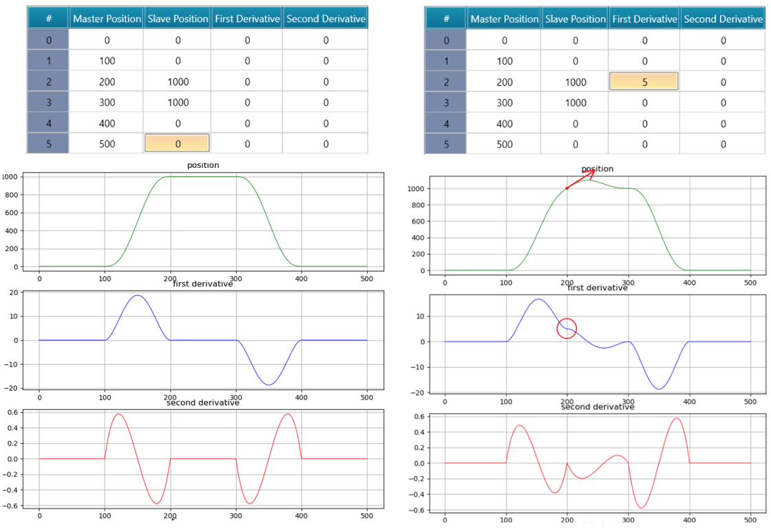 The example below illustrates how the first (velocity) and second (acceleration) derivatives, influence the curve in a CAM table.