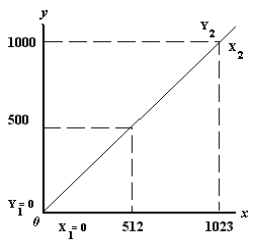 If, for example, X1 and Y1 are 0, and X2=1023 while Y2=1000, the output value will be linearized as graphed. These values would cause: