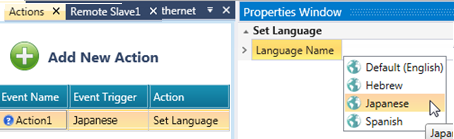 If the Action requires you to select an entity, such as a screen or sound file, make your selection in the Properties window.