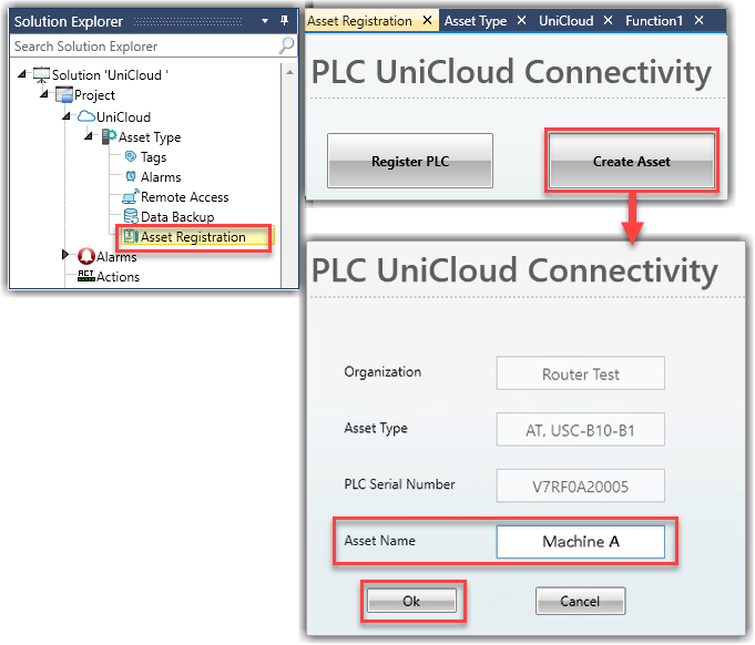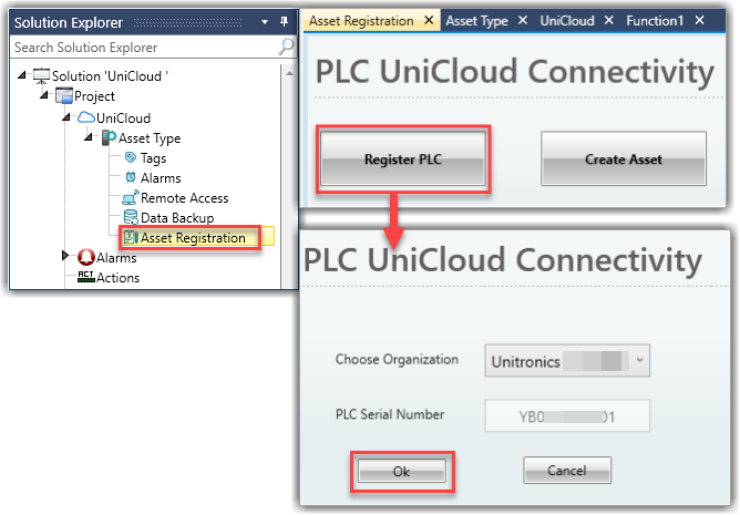 In the Solution Explorer, click UniCloud > Asset Type > Asset Registration, and then click Register PLC to register the PLC with UniCloud.